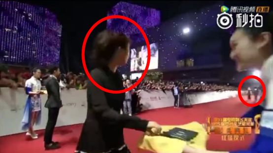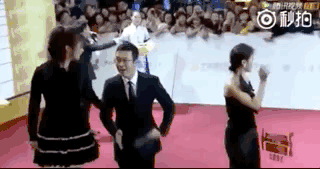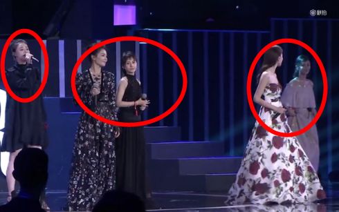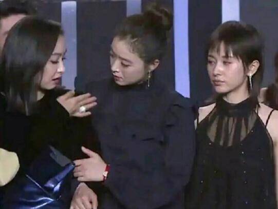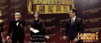 三个人好不容易凑到一起了,侯鸿亮把中间位置让出来,让蒋欣和刘涛站一起,刘涛还是走到了另一边,两位女主全程没有说话……