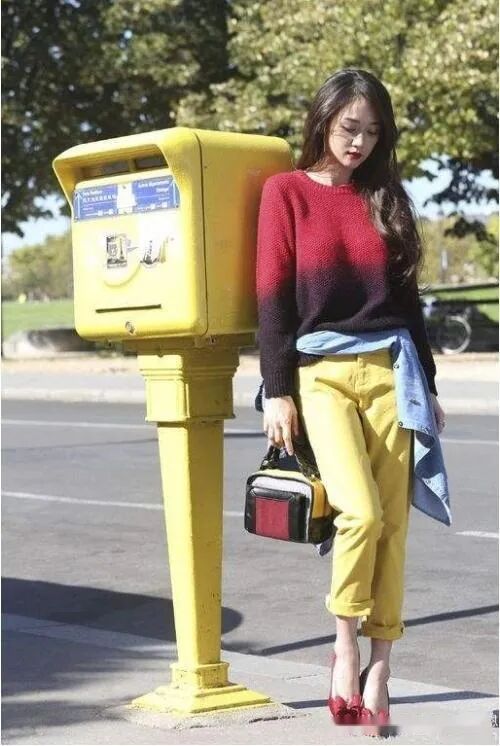 这一张照片的穿搭色彩比上面就稍加丰富,红、黑、黄、蓝,四个颜色构成了这个整体。红黑色渐变毛衣给人一种层次感的递进,腰间的蓝色牛仔装饰是过渡到下身黄色的裤子。最后脚间红色的鞋子与毛衣配色交相呼应,有时一个时尚简约的完美穿搭,背上红黑黄三色系的包包,出门逛街,你就是陈乔恩一样的明星美女。18岁美少女的既视感。