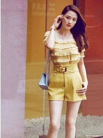 收身简约的连体小黄裙子,上身飞边的设计,让陈乔恩的俏皮少女感十足,下身短裤的大长腿更是展现陈乔恩非同一般的身材,整个衣裙很好的展现了陈乔恩的身材曲线,让人很是羡慕,蓝色的包包给通身的黄色加了亮点,配上性感十足的美腿,时尚简约大气,少女感挡都挡不住。