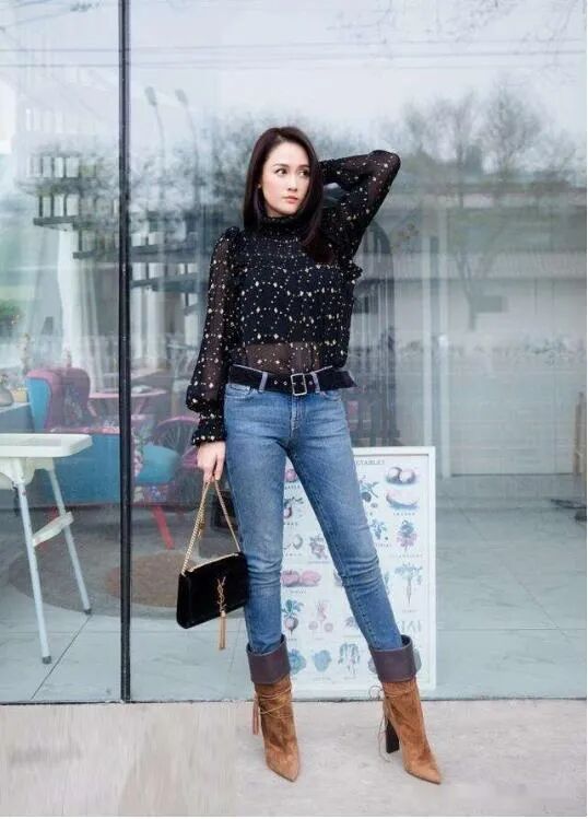 牛仔裤搭配黑色半透衬衫,里面穿着深色的小背心,半透的衬衫给人一种若即若离的隐约既视感,依稀可以看到平淡紧致的小腹,以及纤细的手臂,下身的牛仔裤的腰带很好的起到了收腰的效果。脚下棕色高跟鞋的搭配有了颜色的渐变,再配上黑色的包包,整个穿搭黑、蓝棕三色,简单明了,有种上班族的大气简约,大家一起学起来,上班,逛街穿起来!