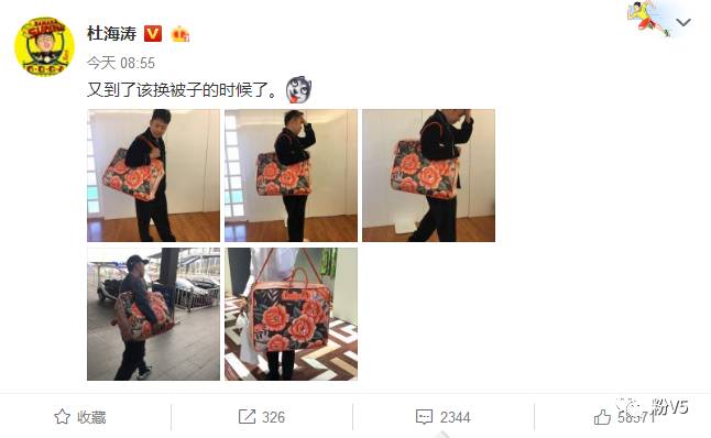 11月8日上午,杜海涛在微博晒出一组造型奇特的照片,背着某时尚品牌的大手提袋摆出各种pose,模样十分滑稽。