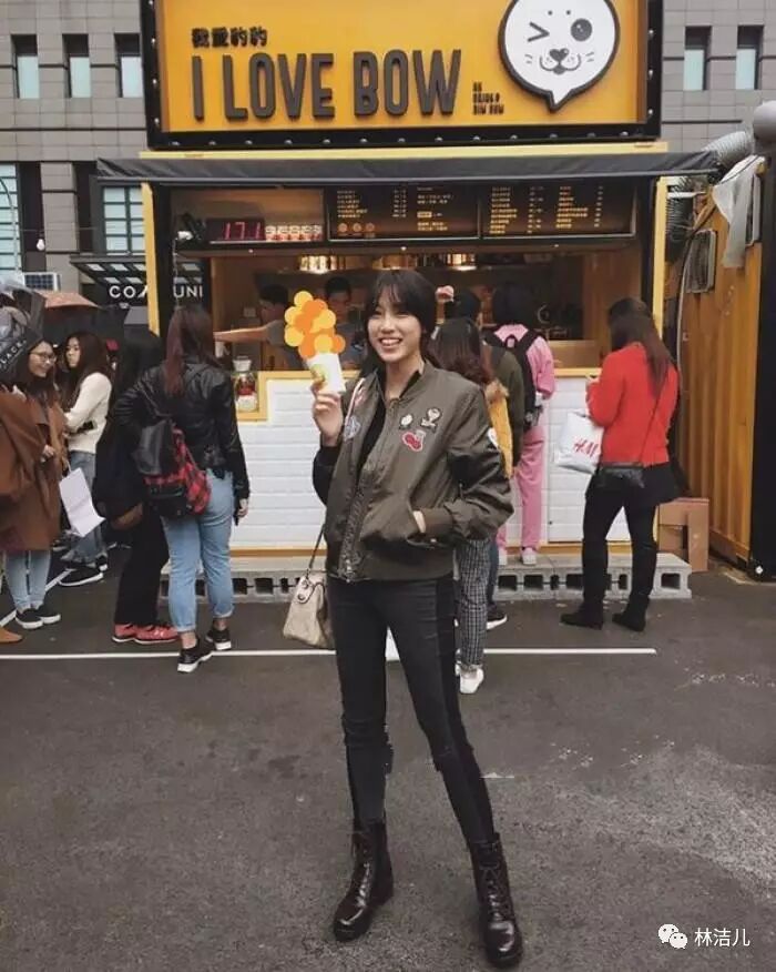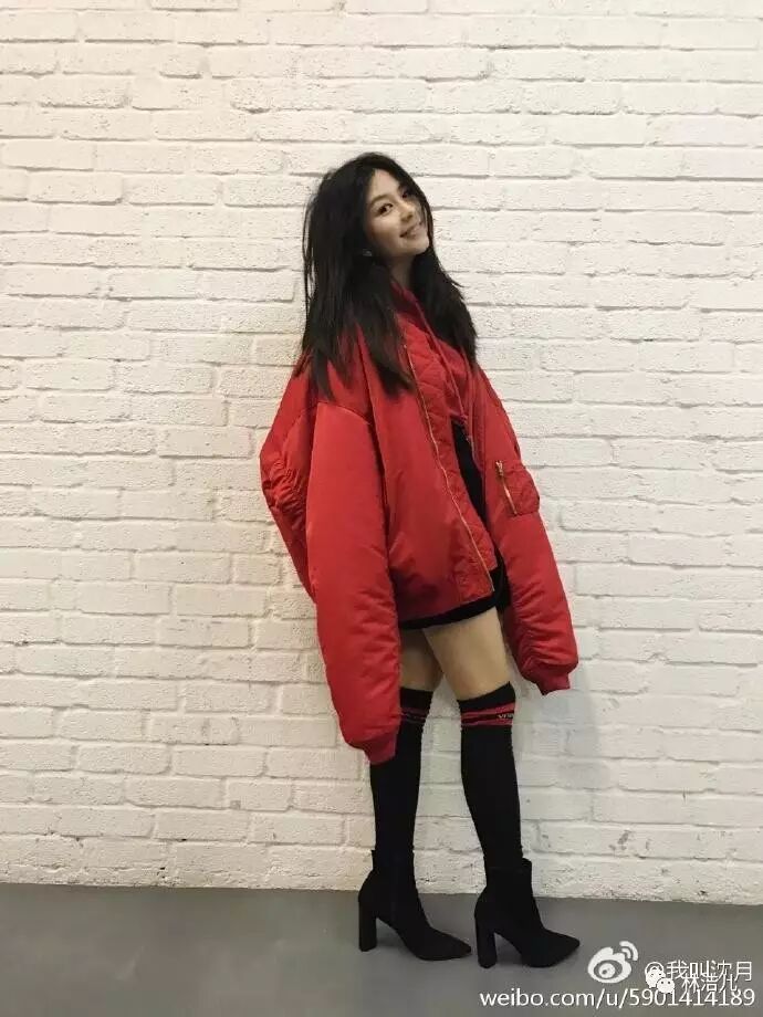 换上了红色Oversize飞行夹克+黑色短靴后,变身街头酷girl,有颜就是任性,虽然有种偷穿大人衣服的赶脚,但妹纸的大长腿着实瞩目。