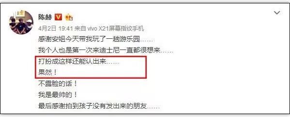 事后,陈赫亦在微博发文表示,当天是个人首次去迪士尼游玩,主要是仰仗女儿安安的份上才去的,他还自嘲是精装打扮居然被认出。