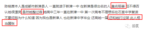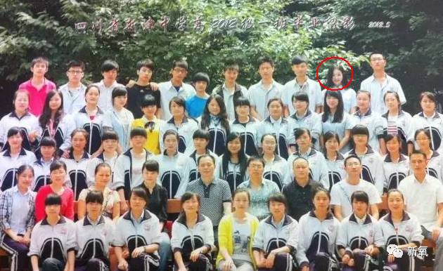 还有一张她在2012年在新津中学毕业时的毕业照流出来,而她2013年才读大学,可见确实是在石室中学复读了一年。而且从当时的毕业照来看,最后一排只有她一个女生,感觉她的人缘可能确实不太好。