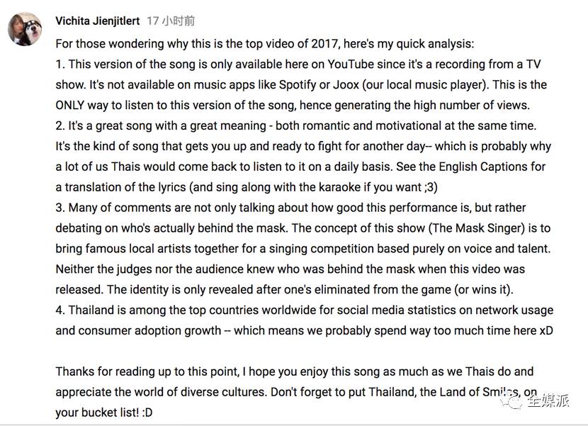 “这首歌的这个版本只在YouTube上有,其他的音乐应用比如Spotify或者Joox(泰国的本土应用)都没有收录;这首歌的寓意很好,既浪漫又励志,所以我们很多泰国人都会日常听听;在全球范围里,泰国的社交媒体使用率位居前列,可能我们在YouTube上耗的时间太多了:D……”