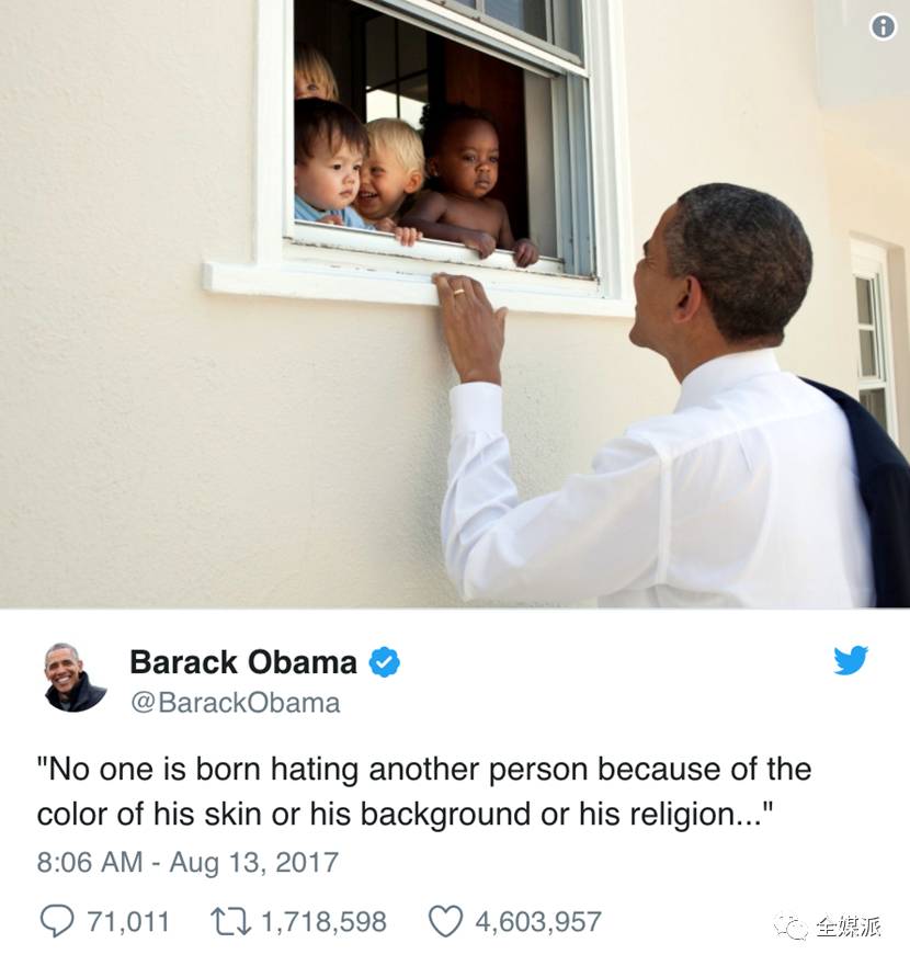 点赞数最高的一条tweet来自奥巴马,对种族平等的呼吁击中了人们心中最柔软的地方,“没有人生来就因肤色或宗教而憎恨他人”。