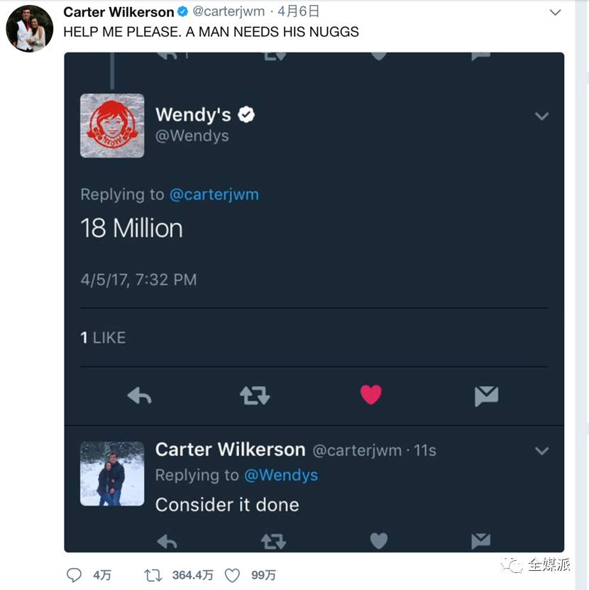 在这一年中,转发量最高的一条tweet既不是名人轶事,也不关于天灾人祸,而是一个挑战——美国内华达州雷诺市16岁的男孩Carter Wilkerson因想吃一年份的免费Wendy汉堡鸡块,进行了免费鸡块挑战:他的推文必须达到Wendy汉堡指定的1800万次转推。这个求助帖激起了网民们助其“圆梦”的欲望,虽然最后的转发量为300多万,并没有达到Wendy汉堡的免费门槛,但是它也斩获了Twitter年度转发量之首的殊荣。