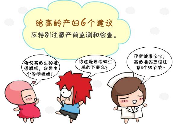 第一,孕前体检:高龄产妇在计划要宝宝前要定期到医院检查身体,从而判断身体能否怀孕,。同时,丈夫也要做相应体检,保证身体的健康。