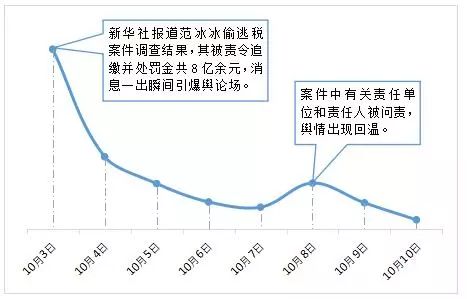 10月8日,依据相关条例、法规,国家税务总局责成江苏省税务局对在范冰冰偷逃税案件中,因管理不力、负有领导责任的相关单位和人员进行问责。“中国新闻网”“中国经济网”“中国网”等媒体对此进行跟踪报道,舆情出现小幅回温。