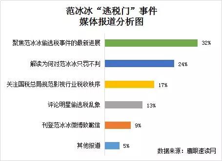 其他媒体报道占5%,主要为“范冰冰的致歉信成中学生改错题”“外媒关注范冰冰偷逃税被罚8.83亿”“发表崔永元长文”“霍尔果斯大量影视公司注销”等。