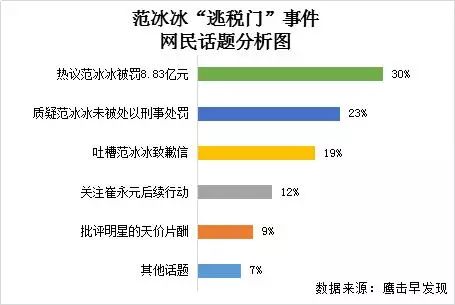 范冰冰“逃税门”事件,从崔永元曝光“阴阳合同”伊始到公布对范冰冰处罚决定,都引发大量网民的关注和讨论,30%的网民言论热议范冰冰被罚8.83亿元,相继出现了“范冰冰偷逃税8亿”“八个亿是什么概念”等微博话题。部分网民支持这一处罚决定,认为明星是公众人物,更应该依法纳税。法网恢恢,做错了就应该罚。另外,也有不少网民对于罚款数额之多表示震惊,微博用户@小螺号滴滴地吹__发表博文称,一辈子活100岁,年薪20万,9个亿需要赚45辈子,45辈子就是4500岁,也就是说你要从三皇五帝时期开始赚到现在。