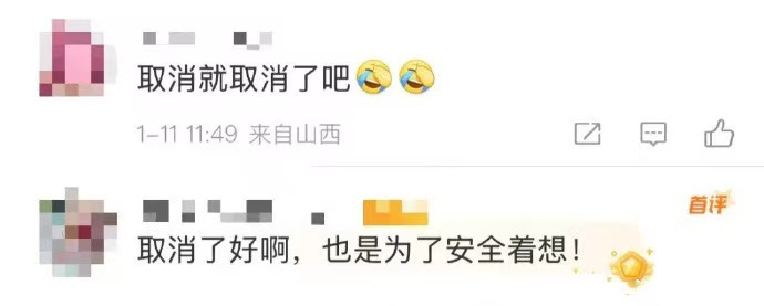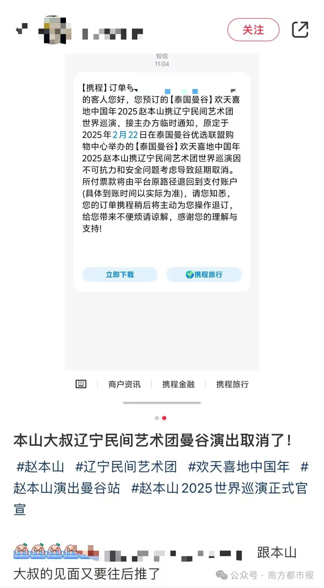 据媒体消息,1月11日,有网友发帖称,收到“赵本山曼谷世界巡演取消”的短信。据大麦网APP显示,1月9日,“欢天喜地中国年”2025赵本山携辽宁民间艺术团世界巡演-曼谷站宣布延期。公告称:“基于不可抗力和安全问题考虑,我们遗憾地宣布,原定于2025年2月22日在曼谷举办的‘欢天喜地中国年’演出将延期。”公告中还提到,为保障大家的权益,所有通过各官方购票平台(包括Infinite、大麦、携程、Trip、Ticketmelon)购买的门票,将全额退款。11日,相关话题冲上热搜。网友们表示支持,“取消是为了安全着想”。1月10日,陈奕迅也宣布取消了“陈奕迅 FEAR and DREAMS 世界巡回演唱会曼谷站。(此前报道→陈奕迅曼谷演唱会取消!将全额退款)
