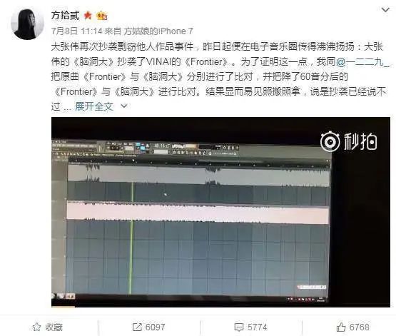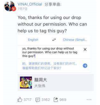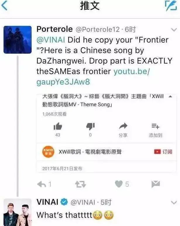 于是就有学音乐的瓜友将大张伟的《脑洞大》直接挂在了推特上,顺便还艾特了VINAI,并询问对方这是否算是抄袭。