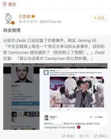 好嘛,大张伟这一回怼,彻底燃烧了梁欢的斗志,立马晒出了艾特了原唱Zedd后的回应: