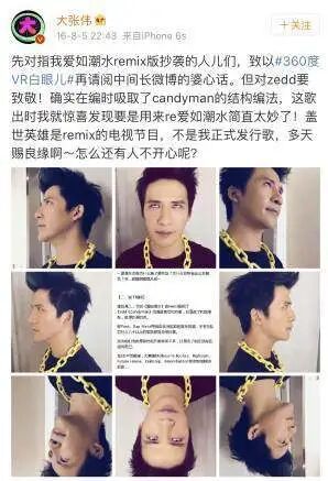 2016年8月,大张伟参加了某个节目,演唱了一首《爱如潮水Remix》,转头就被音乐人梁欢指出照搬德国歌手Zedd的大热单曲《Candyman》。