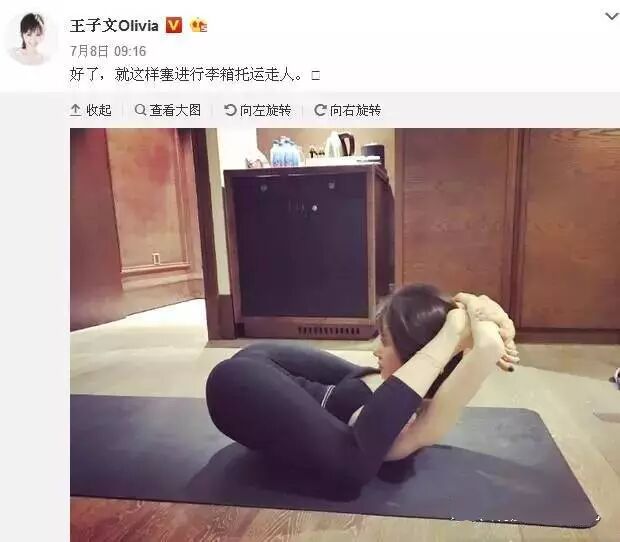 “最近脑公这是瑜伽上瘾了,话说啊,我的行李箱很大!!!!!快来吧,我要把你卖了,啊哈哈哈哈”