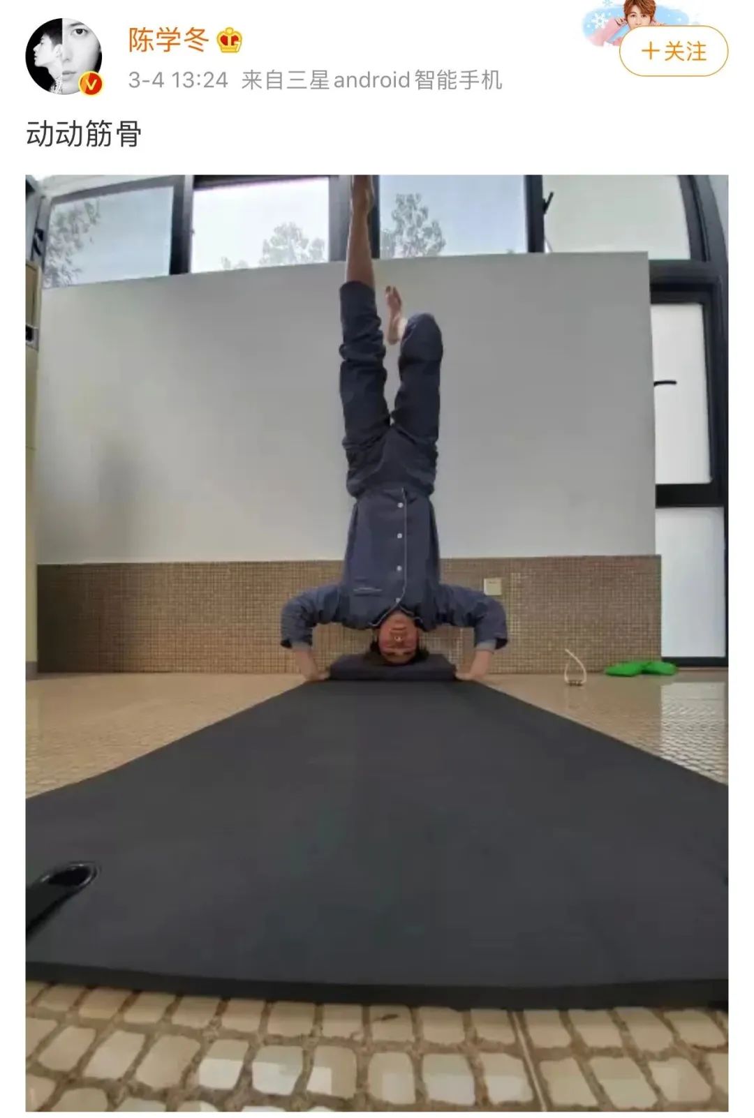 在家活动筋骨练倒立。