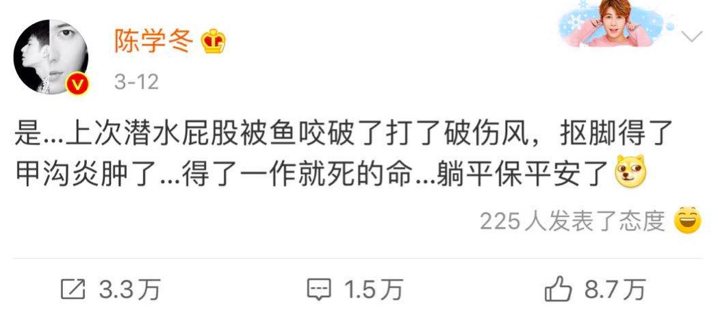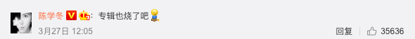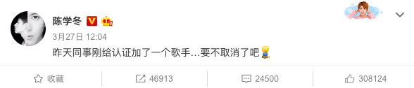 已经主动自黑的陈学冬,还豁出去的自曝同事刚给认证加了一个歌手,要不取消了吧。专辑也烧了吧。