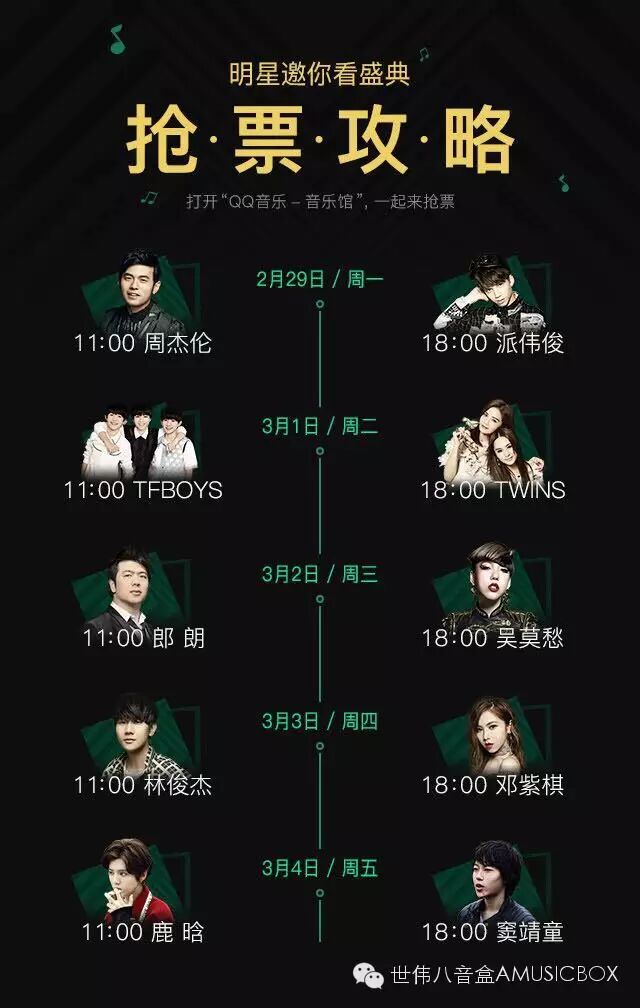 2月29日11点,本届QQ音乐巅峰盛典巨星队的队长周杰伦率先亮相QQ音乐馆,开始为粉丝们免费派票!而当天下午18点,周杰伦力捧的新人派伟俊第二个亮相,继续免费派票!