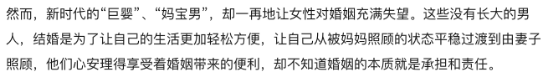 男人长不大,逃避责任,女人过于强势,死命承担。这种女强男弱,实质上是“丧夫式”婚姻的另一种形式。