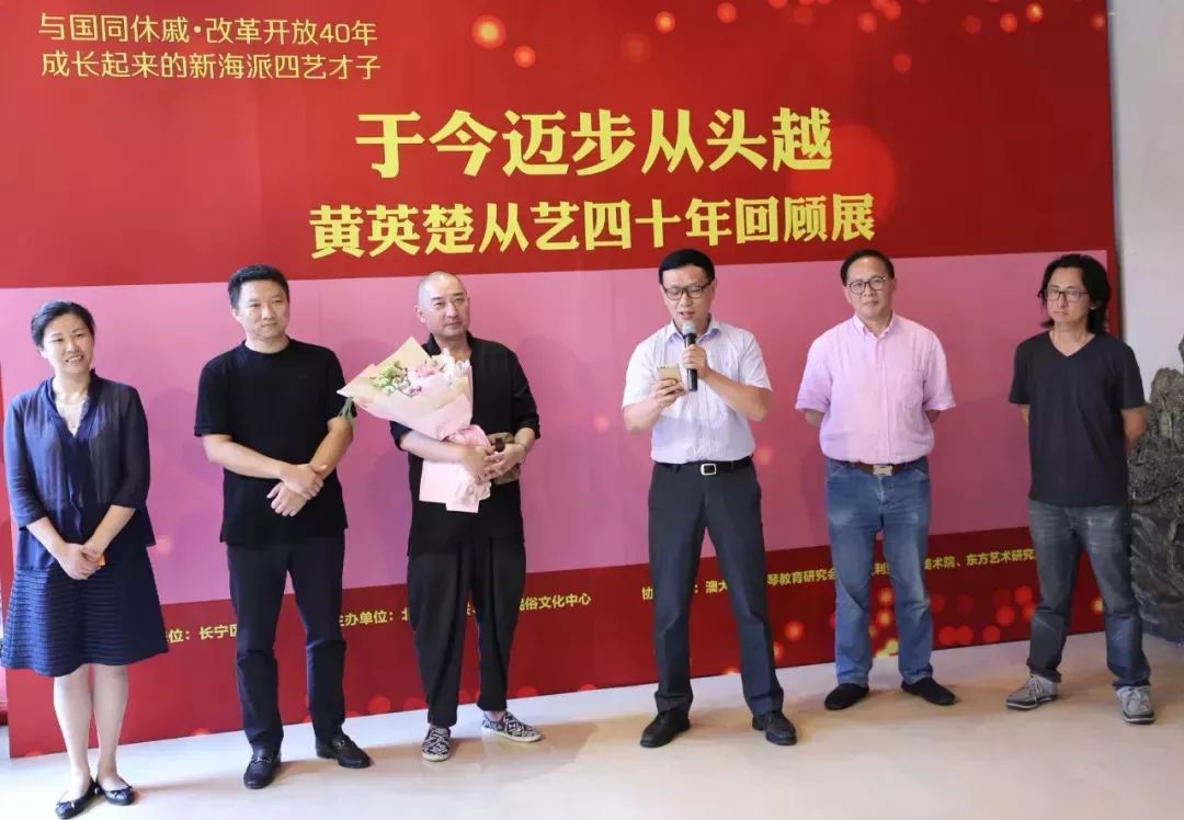 8月21日下午,“于今迈步从头越 黄英楚从艺四十年回顾展”开幕式举行。出席此次开幕式的重要嘉宾除人称“四艺君子”的黄英楚教授之外,还有原长宁区区委常委、区委决策咨询委员会副主任、上海市福建商会执行会长、福建省驻上海办事处党委副书记王惠宁,北新泾街道党工委副书记焦文艳,长宁区侨联兼职副主席、新长宁集团有限公司副总俞志辉,上海电影译制片厂副厂长、配音演员张拯,上海电影制片厂导演马忠,以及此次活动重要的“牵线人”夏英东。黄英楚教授致辞感谢多方的合作才能在“改革开放四十周年主题日”这样重要的日子为大家带来有深刻意义的作品。接着由长宁区侨联兼职副主席、新长宁集团有限公司副总俞志辉先生宣布:“于今迈步从头越 黄英楚从艺四十年回顾展”正式开幕!