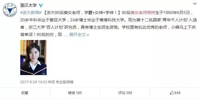 浙江大学电气工程学院90后美女老师杨树,作为学霸+女神的结合体,她也在微博上引起了广泛的关注。