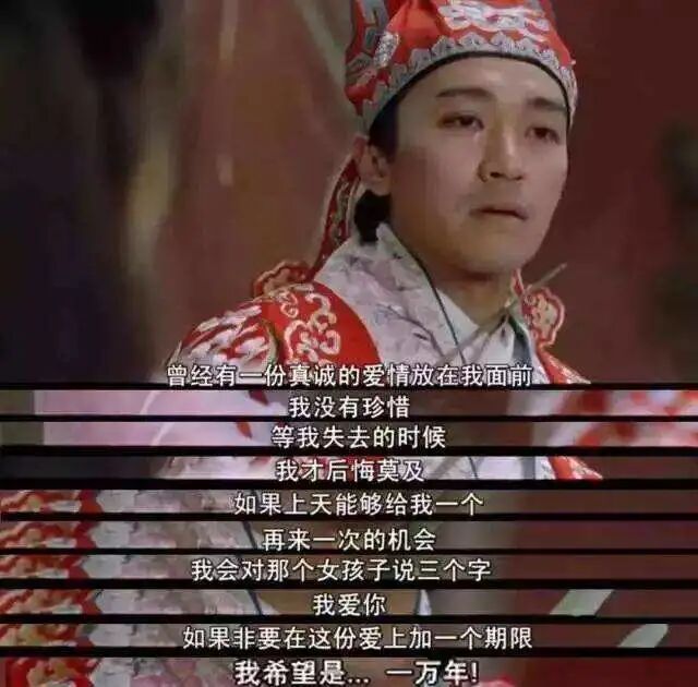 但是在降魔篇中,他却说:如果可以给我一个机会,我会重新说这句话,一万年太久,爱我,就现在。