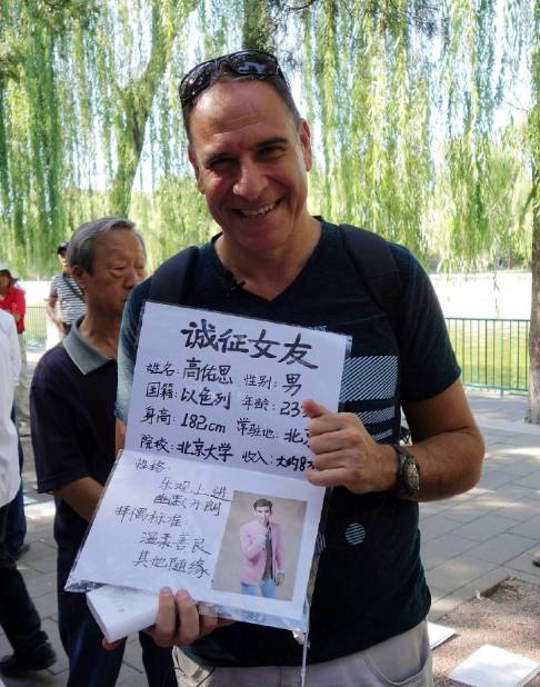 17日,北京,50多岁的以色列人阿米尔在京工作多年,现在一家投资公司工作。他热爱中国、喜欢北京,希望同样在京工作的儿子能找个中国女朋友结婚。为此,他来到中山公园相亲角,举牌为儿子征婚。(人民日报)