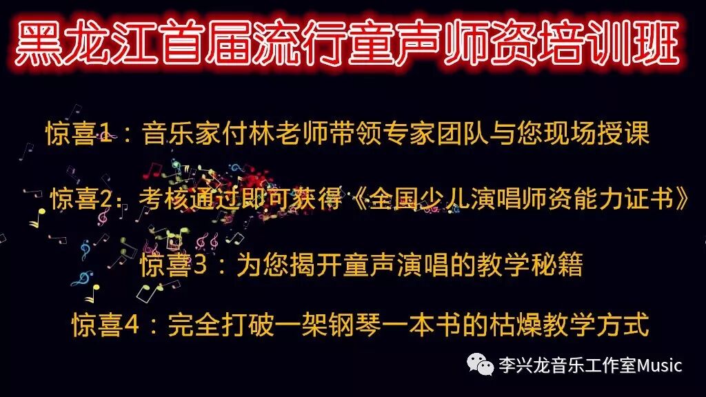 本次活动是由付林音乐+联合黑龙江省流行音乐协会、李兴龙音乐工作室共同主办,规范流行音乐教学市场,普及流行音乐教学知识为目的,打破一架钢琴一本书的传统教学理念,让您的办学讲课离孩子更近一些!本活动定于7月24号在哈尔滨隆重举行为期2天的全方位立体培训,我们将通过建店标准化、服务体系、招生技巧、教学实例、课程设计、华语CPMV流行演唱认证、等七大课程进行专业、系统、立体的全面讲解,让您的办学与教学更轻松!这是一次具有权威性、专业性和实用性的真正大师课!