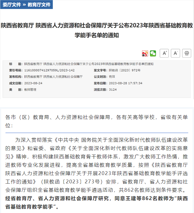 热烈祝贺我校荣飞老师荣获省级“教学能手”称号 彩虹中学南校区 内地男星 2023-08-30 18:05:26 190 创作不易,用心坚持,欢迎请BaGua喝几杯爱心咖啡!打赏并支持本文 打赏并删除本文 喜报热烈祝贺我校荣飞老师获得陕西省“教学能手”称号荣飞扎根沃土,深耕教学;踔厉奋发,勇毅前行。近日,在省教育厅、省人力资源和社会保障厅公布的2023年陕西省基础教育教学能手评选中,我校荣飞老师榜上有名。祝贺荣飞老师!我校荣飞老师荣获陕西省“教学能手”称号,充分展示了我校教师优秀的教学水平和“自强不息敢争第一”的精神风貌。希望全校教师以获奖老师为榜样,不断磨砺教学技能,为我校教育事业发展贡献力量。编辑|孟 晨责编|吴雨倩审核|苟 韬 创作不易,用心坚持,欢迎请BaGua喝几杯爱心咖啡!打赏并支持本文 打赏并删除本文 感谢您的支持鼓励,我会继续努力的!文章地址:用户邮箱:打赏金额:USDT 请输入数字点击”去打赏“,即可进行打赏支持本文章哦 荣飞 发表评论