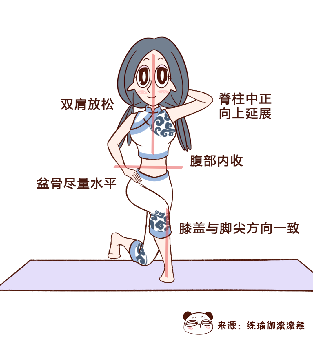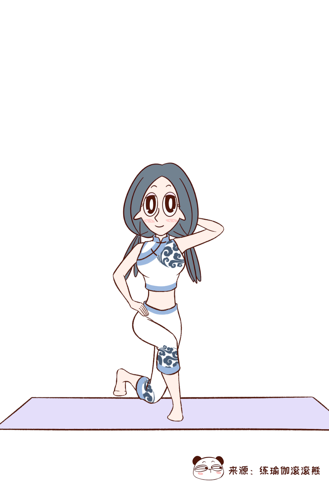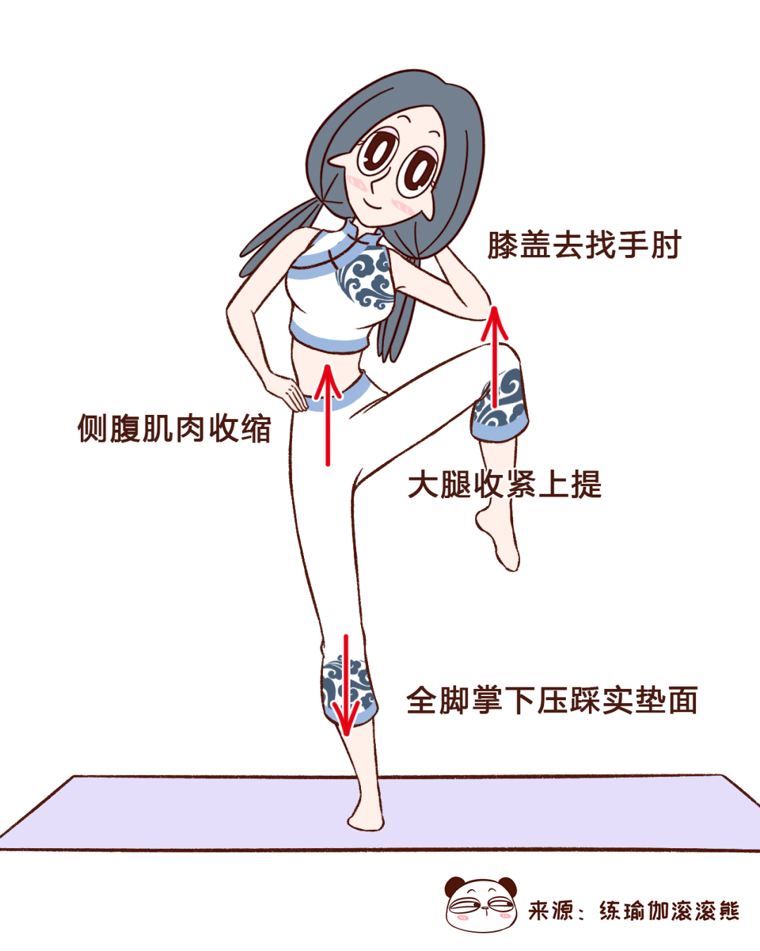 ●吸气,屈左膝上提去触碰左手肘