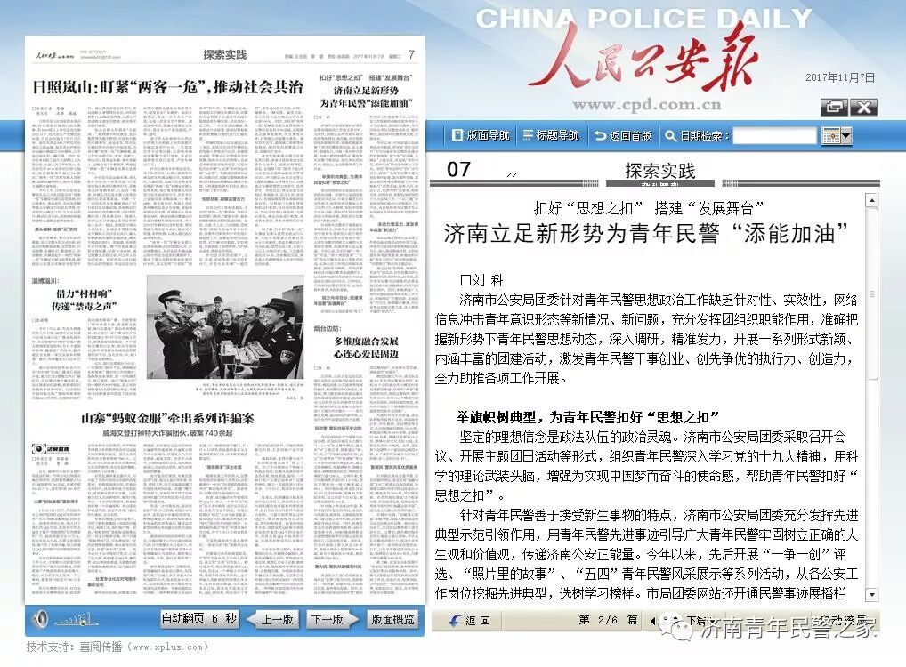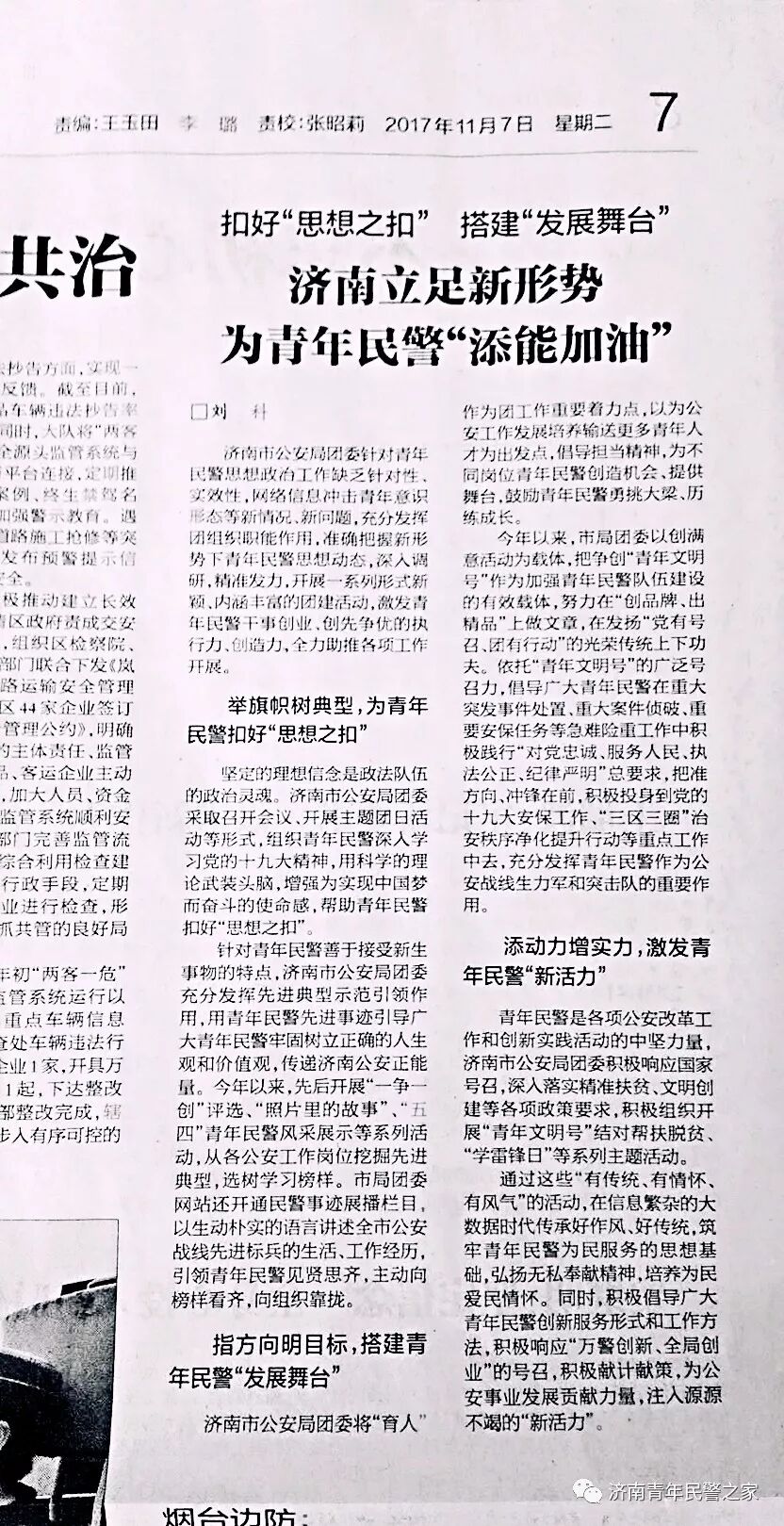 《人民公安报》2017年11月7日刊登我局团委刘科的文章《扣好“思想之扣” 搭建“发展舞台” 济南立足新形势为青年民警“添能加油”》,文章称, 济南市公安局团委针对青年民警思想政治工作缺乏针对性、实效性,网络信息冲击青年意识形态等新情况、新问题,充分发挥团组织职能作用,准确把握新形势下青年民警思想动态,深入调研,精准发力,开展一系列形式新颖、内涵丰富的团建活动,激发青年民警干事创业、创先争优的执行力、创造力,全力助推各项工作开展。文章原文如下: