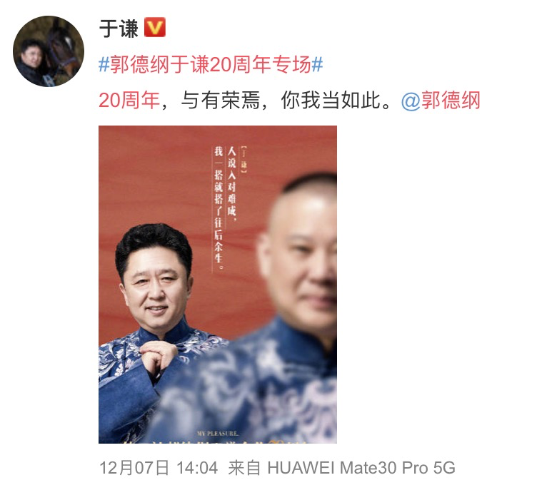 于谦说过,“我回来说相声是因为你,有朝一日你要不说相声了,我也就不说了”。