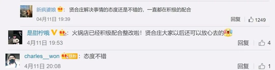对于上述事件贤合庄的处理方式,不曝光不解决的态度,竟然还有粉丝觉得不错,更夸张的是还有一千多人点赞,我真怀疑这是一群黑粉,刷新正常人的三观。