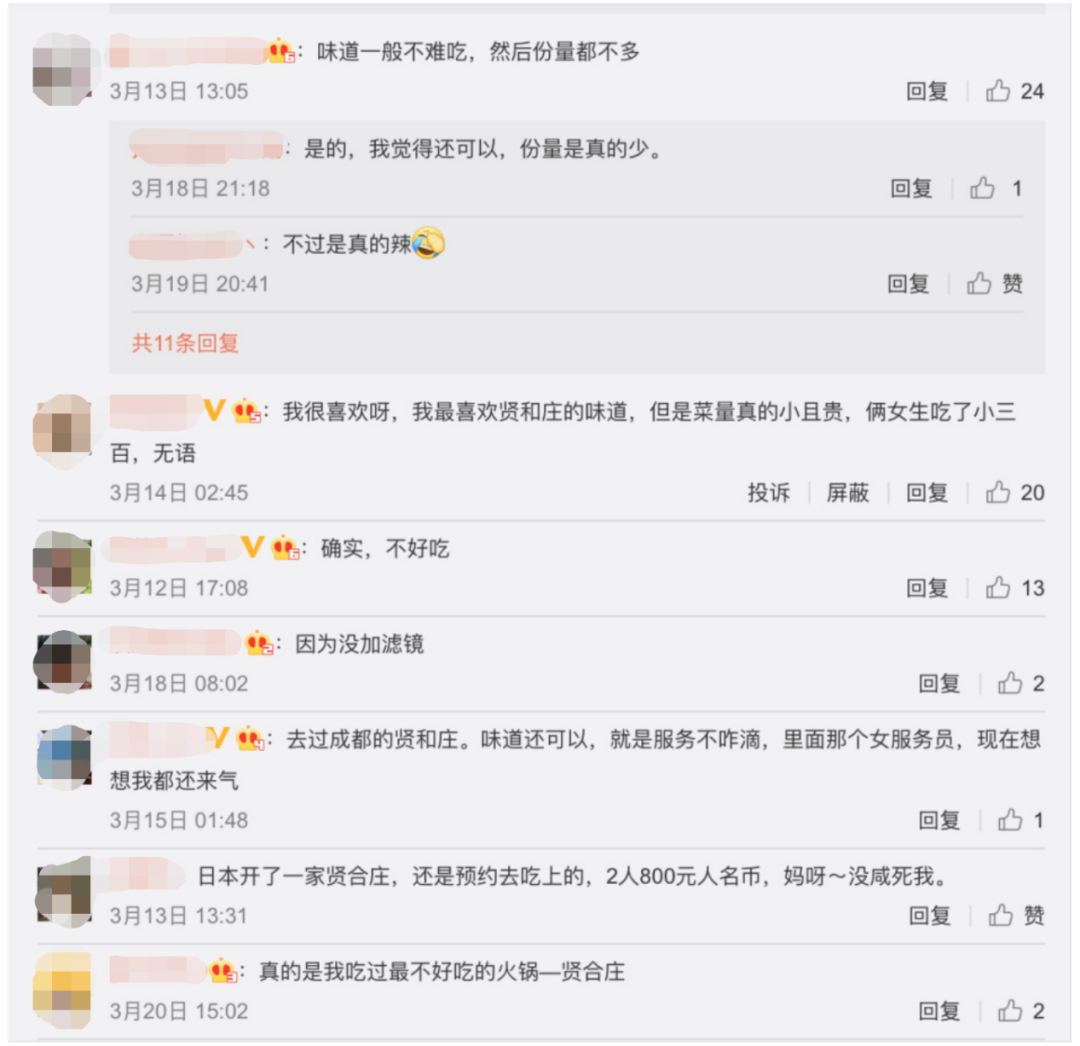 不少去贤合庄消费过的用户都表示不会再去第二次,在大众点评跟美团App的评价中,“火锅底料价格昂贵,菜品菜量极少”的观点也占据了评论的较大比重。