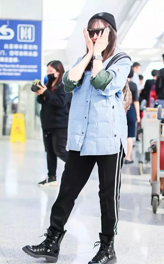 张天爱在棉衣下面穿着一件很普通的运动裤,但是张天爱把运动裤的裤脚穿在了马丁靴的里面,黑色的运动裤和黑色的马丁靴融为一体,拉长了腿部曲线,这样的小技巧很显腿长。张天爱将运动裤穿出了新高度,学会这一招,小粗腿秒变大长腿!