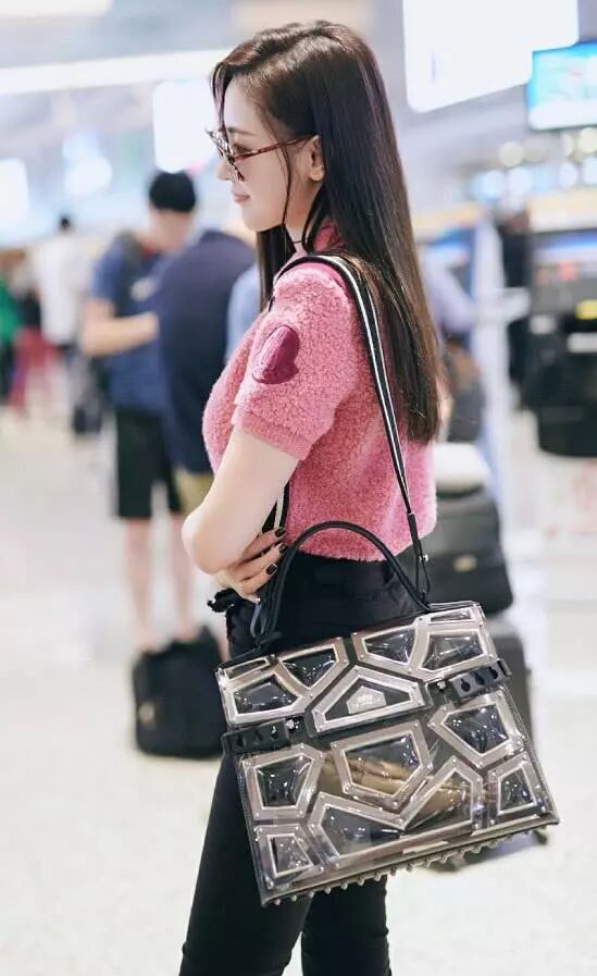 张天爱穿着一件粉红色的上衣,搭配一件黑色的修身长裤,这件修身的长裤很显身材,高腰的设计轻松地拉长了腿部曲线。张天爱背着一个宽大的包包,因为包包的版型很巨大,所以将她的身躯显得很娇小,让整个人看起来娇俏可人。