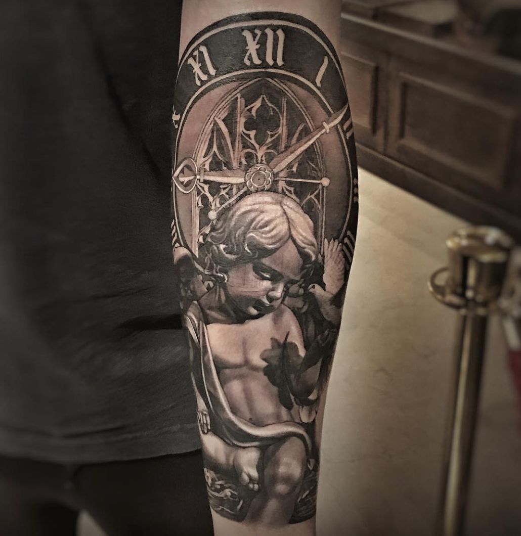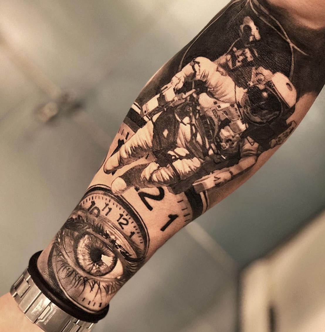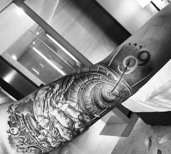 余文乐又拜托好友帮忙牵线,找这位超难约的大师帮自己纹身,接连扎了胳膊上的666,钟楼和复古手枪。