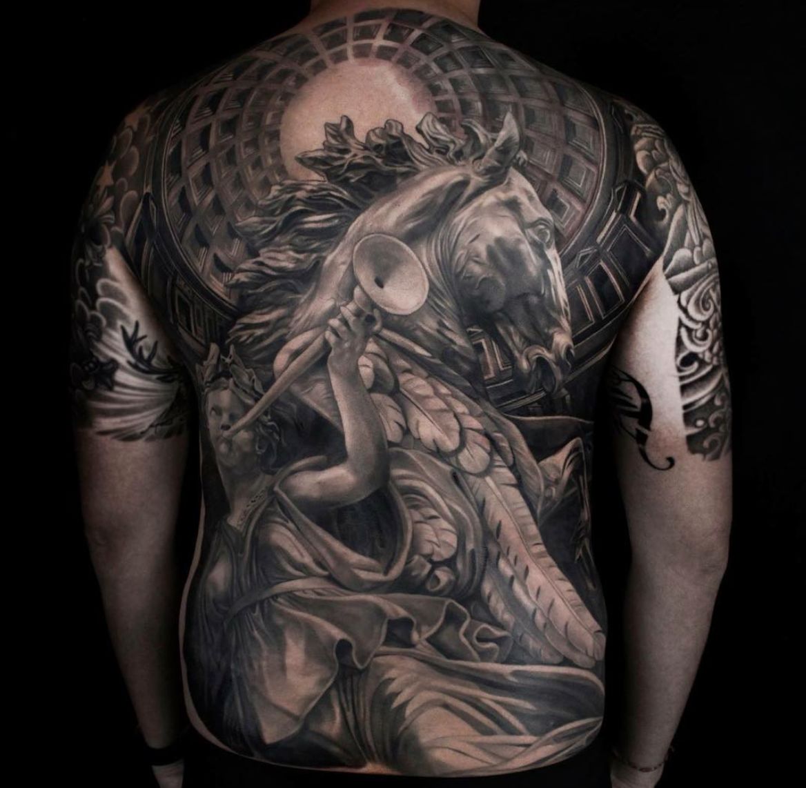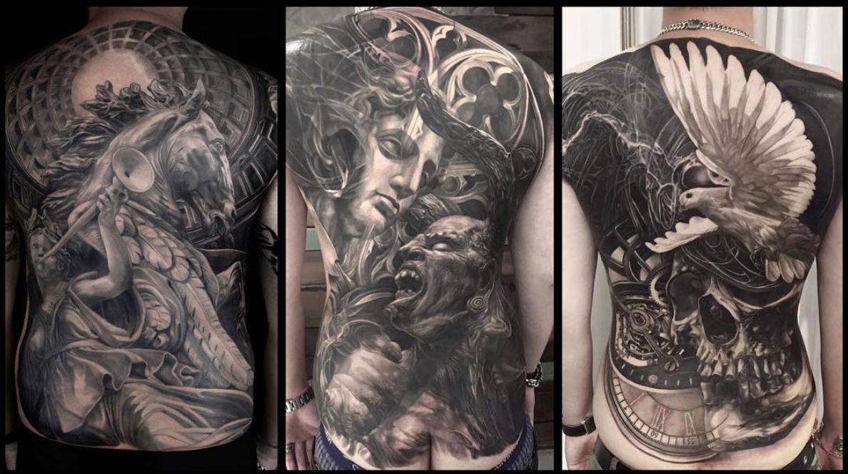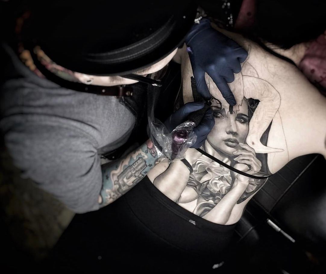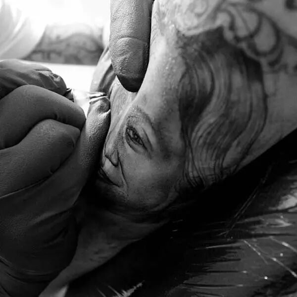 多年的绘画经验给他创作黑灰人像刺青打下了基础,他曾经在12年的澳洲刺青展上拿过黑灰组的世界冠军。