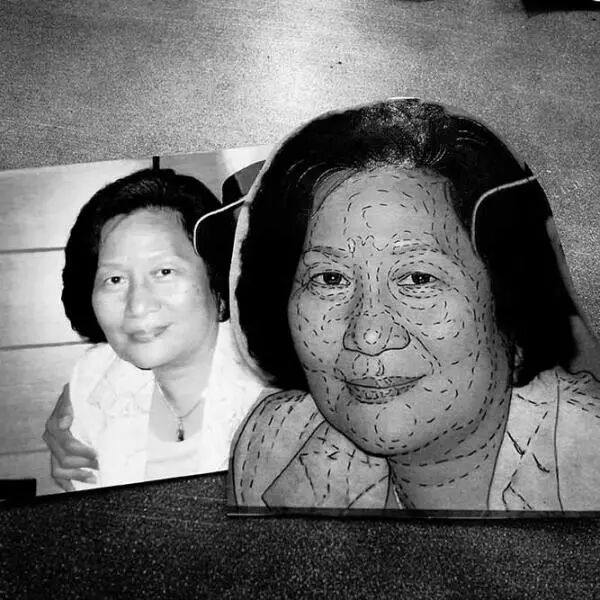 Josh拿着阿姨的照片,依照五官的立体阴影关系定好草稿,最终完成里极具立体感,栩栩如生的肖像。