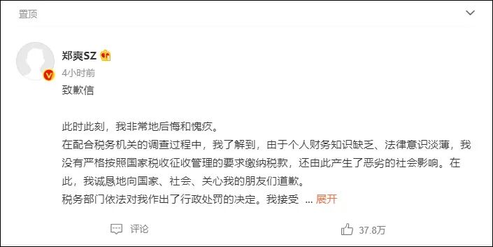 今天下午,郑爽通过微博道歉,表示将克服一切困难按时补缴税款、缴纳罚款。