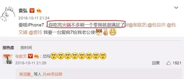 袁弘继续损老婆,说张歆艺有一次吃火锅,吃了3000块钱(明星吃饭就是壕),她刷卡时竟然多刷了一个0,刷了3万块钱,她还毫无知觉。(究竟多有钱?)