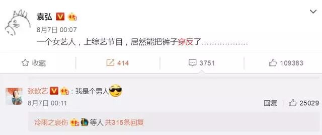 我们来看看袁弘的微博,发现他是这么说的:一个女艺人,上综艺节目,居然能把裤子穿反了……