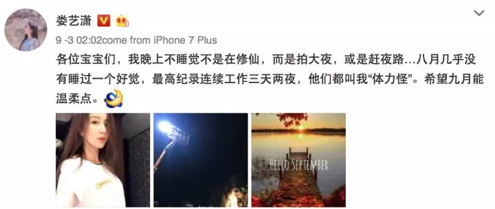 娄艺潇最近几个月连轴转,熬夜赶夜戏,自从参加完《爱情公寓》大电影的宣传,她就埋头去拍戏了,看来新戏问世也快了。