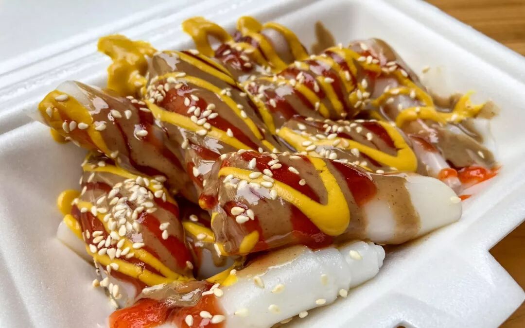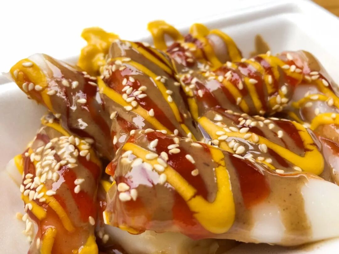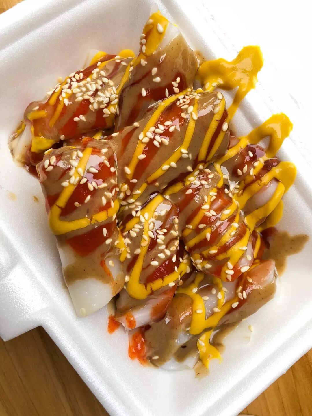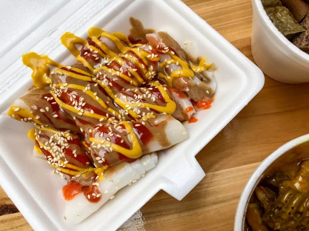 先是捞出白花花的肠粉,然后就是Lee哥的疯狂怼酱,花生酱甜酱,洒些白芝麻,还有最丧心病狂的黄芥末酱