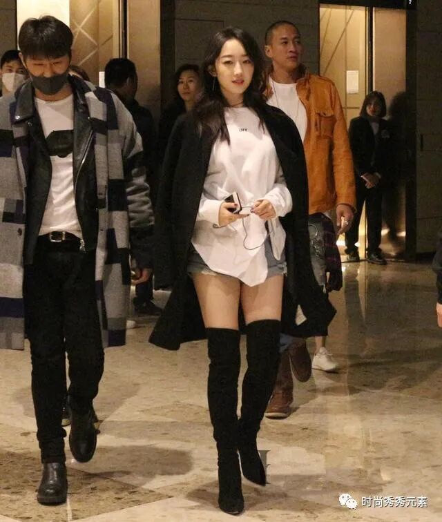 女星的穿搭是就算冷天,也不影响她们露腿。蒋梦婕身穿一件白色T恤,衣摆的捆绑设计增加个性,搭配牛仔短裤和高筒靴,露出一大截腿。外面却披着一件黑色呢子大衣,看着都冷!为了美果然是很抗冻呢!