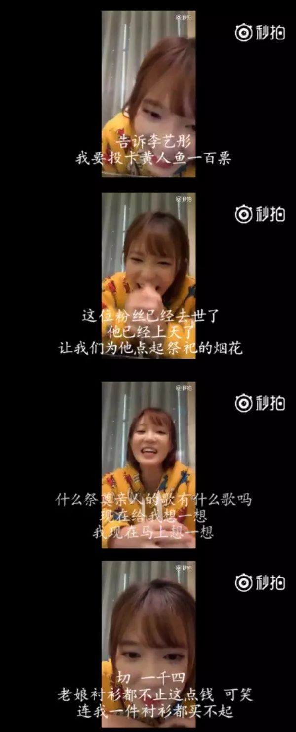之后还在另一个队友直播时看到一个网友在弹幕上发,要给李艺彤卡黄人鱼投一百票,李艺彤听后更是大怒,直接诅咒这位投票的网友已经去世了,“这位粉丝已经去世了,他已经上天了,让我们给他点起祭祀的烟花”甚至还特别欢喜地给这位网友唱各种祭祀歌曲,这是以诅咒别人为乐的节奏吗?