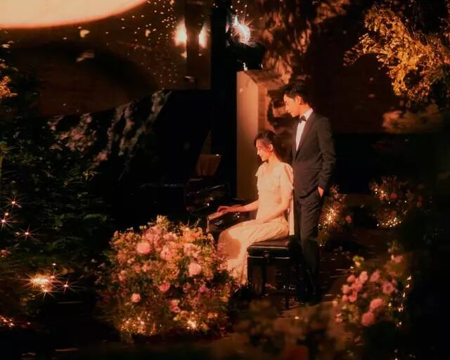 婚礼的内场图也曝光的,以粉色系的鲜花为主,布置的非常精致。婚礼的主题是骑士与精灵公主,所以现场也像童话一样唯美浪漫。