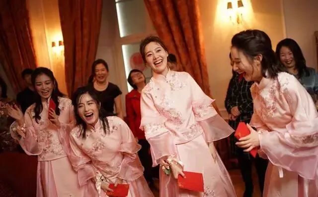 在接亲的环节都有伴娘拦门的习俗,新郎和伴郎除了要接受伴娘们的各种考验,塞红包也是必不可少的。虽然这场婚礼进行的低调,但是非常的温馨幸福。在拦门的环节,不仅手拿红包的伴娘们笑的开怀,在场的亲友也是笑的很开心,可见这场婚礼有多么圆满。