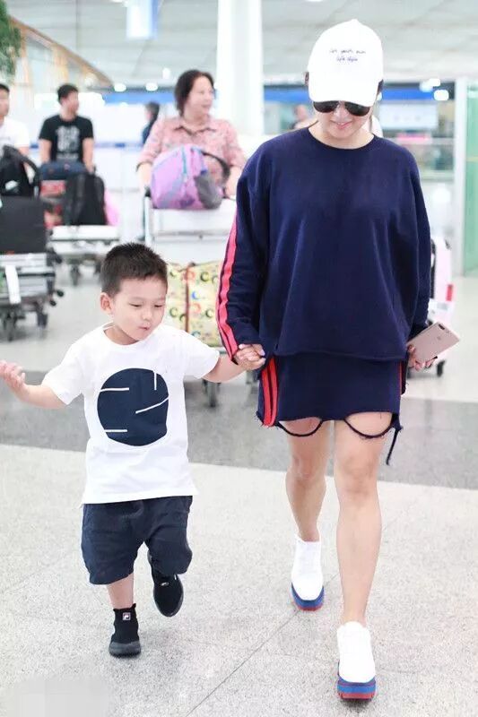 少见的跟儿子同框,为了让自己更显高一点还穿了一双厚底乐福鞋,但是不知道为什么穿了厚底鞋的何洁看上去腿更短了。